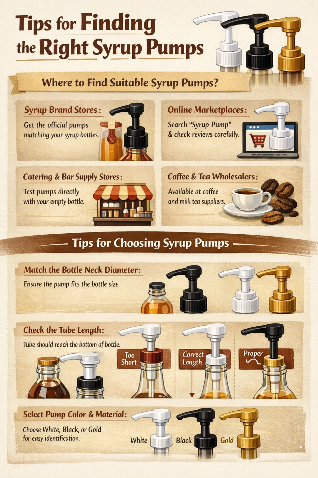Hvis du leder efter de rigtige sirupspumper, men er bekymret for at få den forkerte størrelse, er her nogle tips til at finde dem og almindelige købsmetoder: