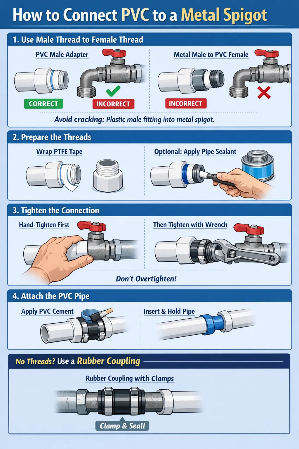 Tilslutning af PVC-rør til en metalstuds (metalhane eller ventil) er en almindelig opgave ved VVS-reparationer i hjemmet. På grund af plastik og metals forskellige hårdhed og termiske ekspansions-/sammentrækningshastigheder er der behov for særlig omhu under tilslutningen for at forhindre utætheder eller revnede beslag.