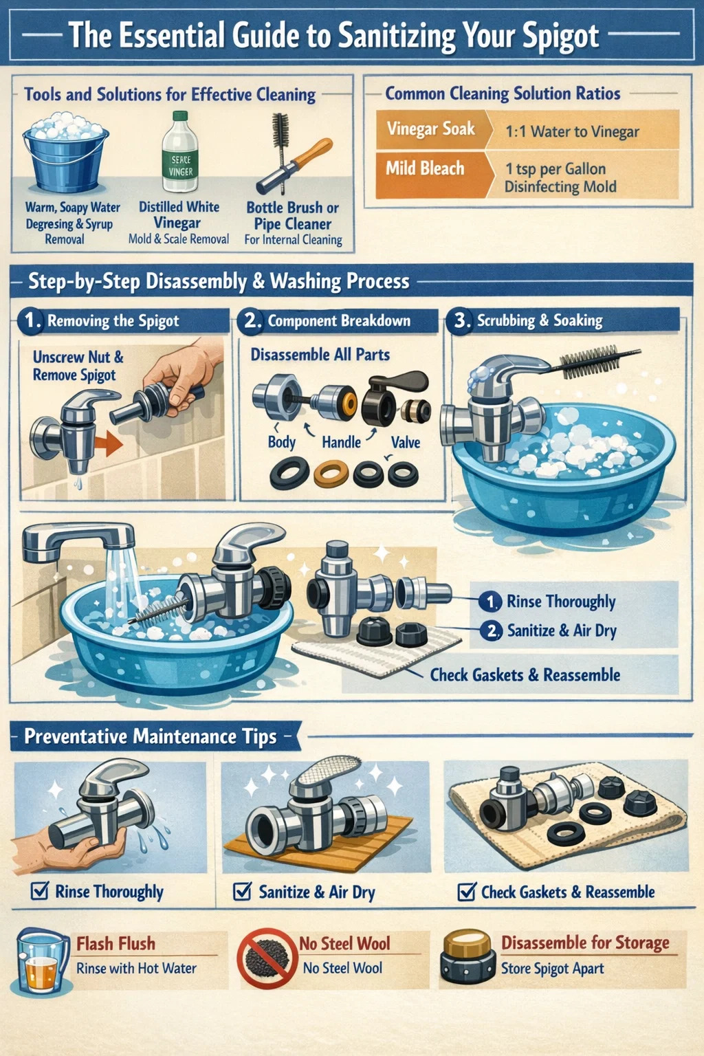 For at opretholde fødevaresikkerheden og forhindre vækst af skadelige bakterier, en tap til drikkevareautomat skal rengøres i dybden efter hver brug eller mindst en gang om ugen, hvis det bruges til almindeligt vand. Fordi studs har indviklede indvendige kanaler, er det utilstrækkeligt at skylle ydersiden blot; fuld demontering er påkrævet at fjerne klistrede sukkerrester og skimmelsporer, der trives i mørke, fugtige omgivelser.
