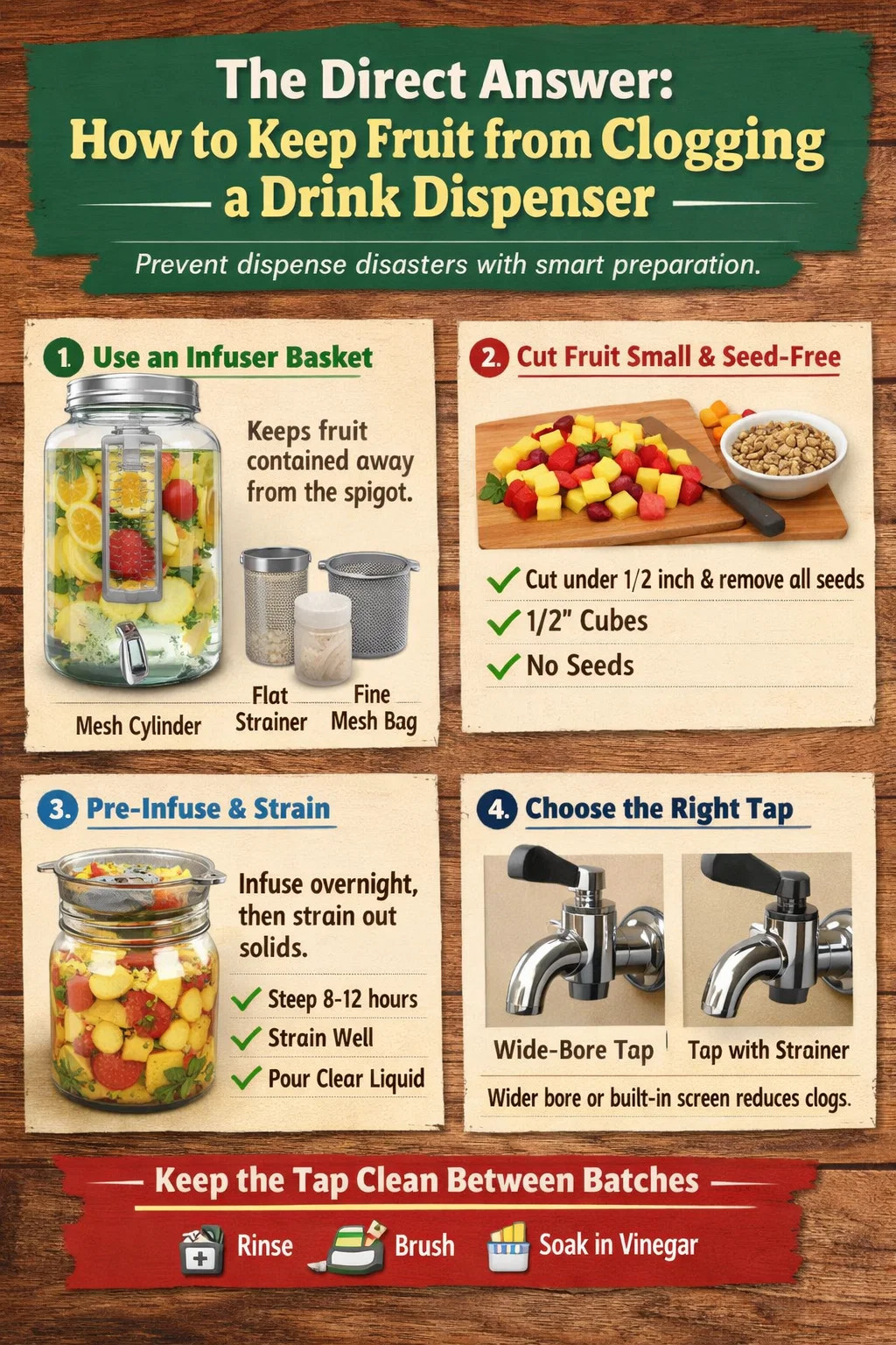 Før du løser problemet, hjælper det at forstå mekanikken. Drikkeautomater - især dem med en drikkevandshane i metal — stol på tyngdekraften til at skubbe væske gennem en smal studs. Denne tap er designet til væske, ikke faste stoffer. Når hele bær, citrusbåde, urteblade eller melonstykker tabes direkte i dispenserbeholderen, flyder de og cirkulerer frit, indtil de når det nederste drænpunkt og kiler sig ind.