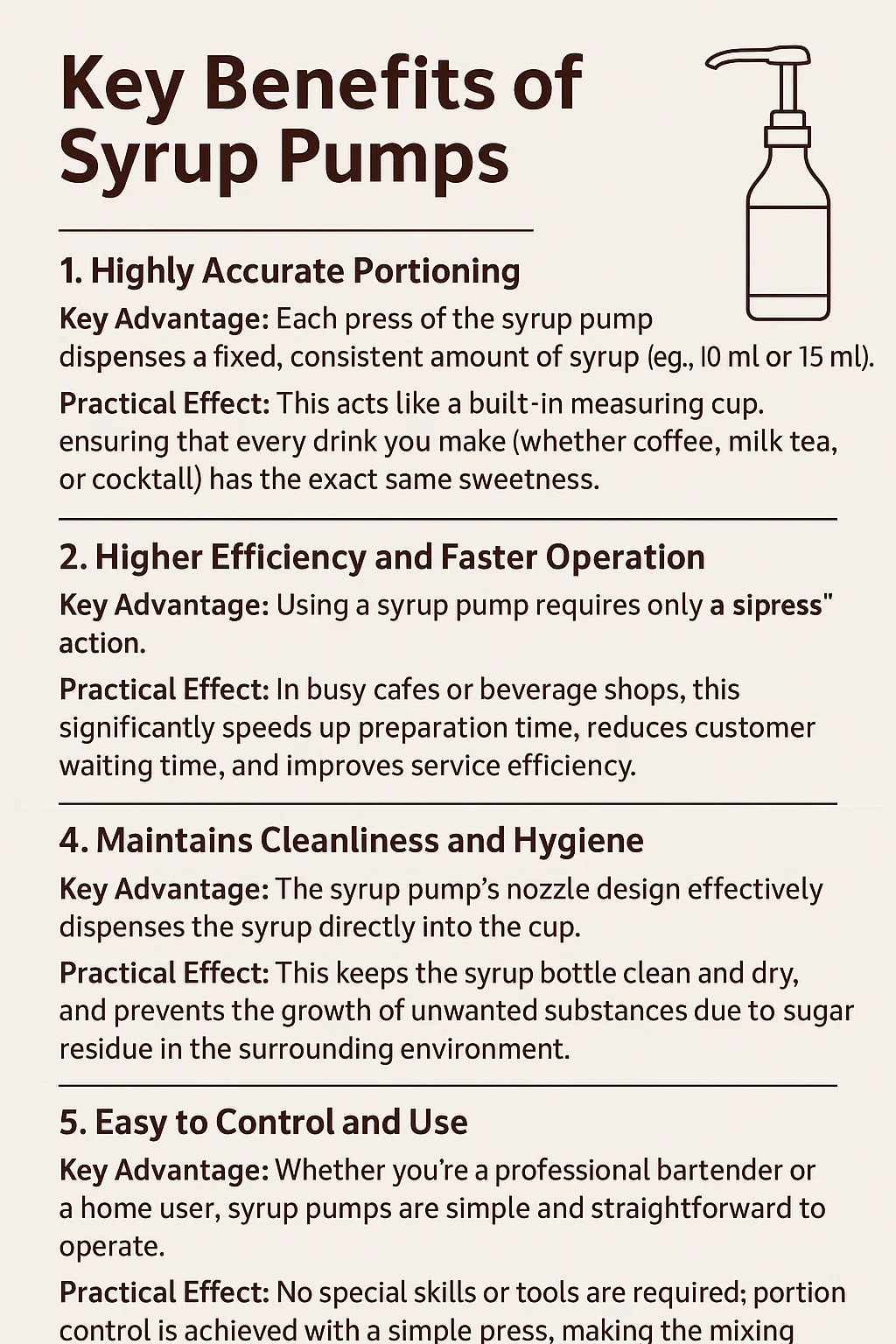 Nøglefordel: Brug af en sirupspumpe kræver kun en enkelt **"tryk"** handling, hvilket eliminerer flere trin, såsom at åbne flaskehætten, hælde, finde et målebæger og derefter lukke låget.