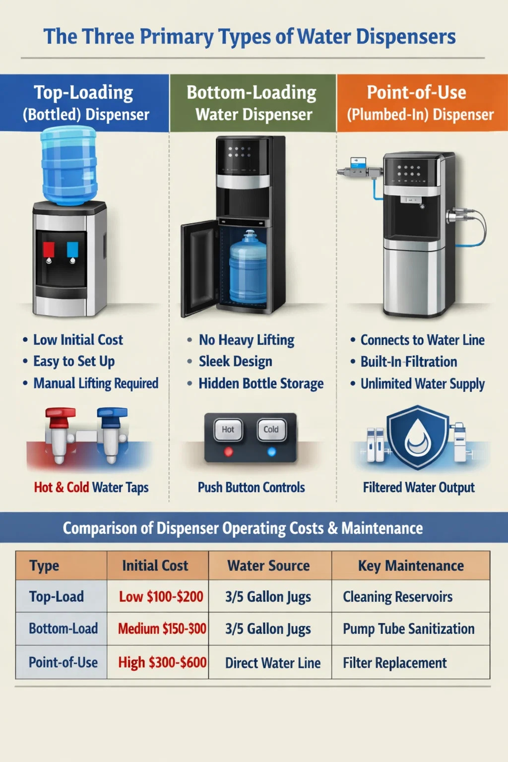 Når man vurderer hydreringsløsninger til et hjem eller kontor, kategoriseres vanddispensere generelt i tre forskellige typer baseret på deres påfyldningsmekanisme og vandkilde: Top-loading (flaske) dispensere, bund-loading dispensere og Point-of-Use (VVS) dispensere. Hvert system bruger en bestemt vandhane konfiguration til at styre flow, og valget af den rigtige afhænger af dit fysiske rum, budget og det ønskede vedligeholdelsesniveau.