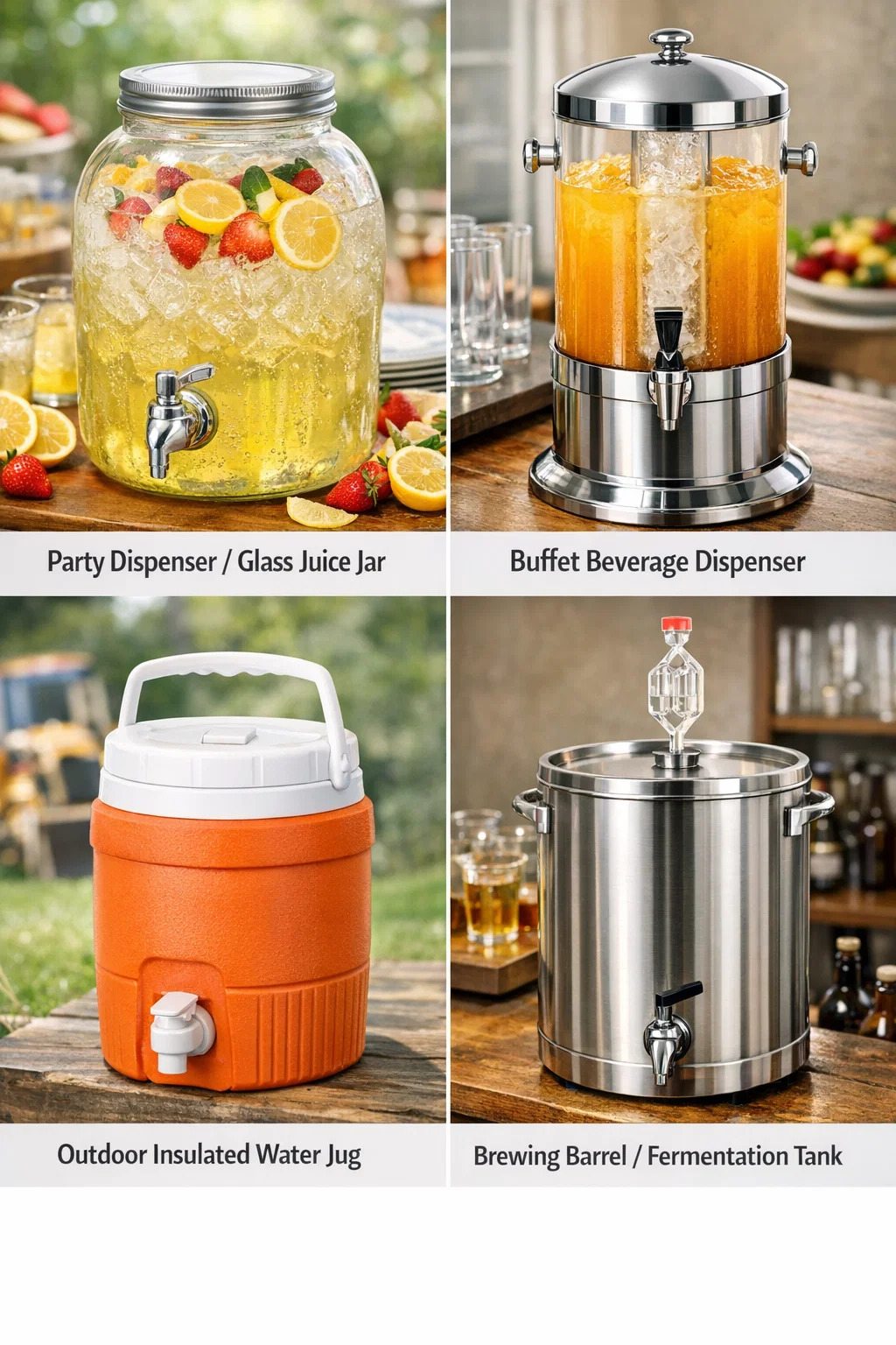I vores dagligdag har disse beholdere med en lille hane, hvor folk samles rundt for at få drinks, flere forskellige navne alt efter udseende og brug. Hvis du søger online eller spørger i en butik, vil du med sikkerhed få det rigtige resultat ved at bruge følgende navne: