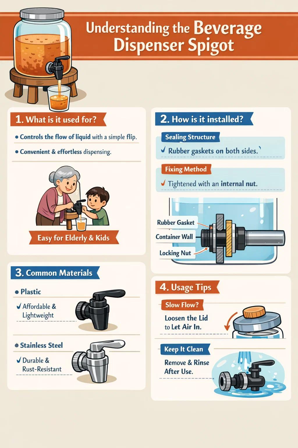 Fastgørelsesmetode: En stor møtrik på indersiden låser hele drikkevaredispenseren fast på beholderen, hvilket sikrer, at saften eller vandet indeni ikke siver gennem hullerne.
